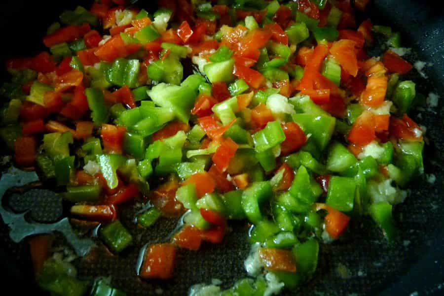 Lava y corta los vegetales en cubitos pequeños. Ralla el zapallo italiano. En un sartén profundo pon a calentar el aceite, añade el ajo junto a los pimentones. Agrega ¼ cucharadita de sal, el azúcar y la pimienta. Luego de 4 minutos agrega el zapallo italiano y el tomate. Deja cocer a fuego bajo por 10 minutos y añade la soja previamente remojada. Añade la salsa de tomate, tapa el sartén y deja cocer por media hora revolviendo de vez en cuando.