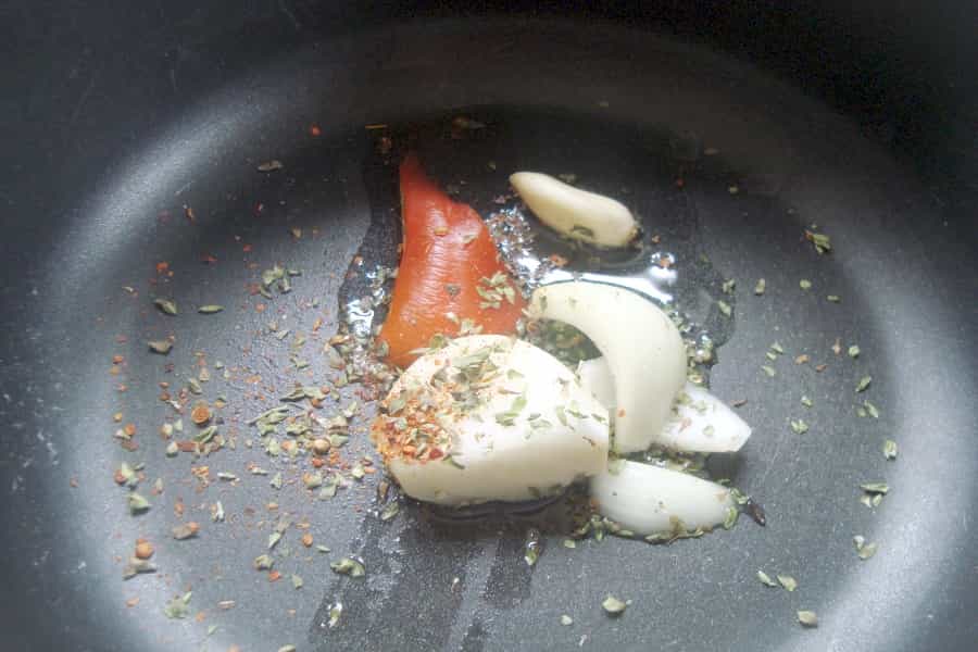 En una olla con 1 cucharada de aceite caliente incorporar cebolla, ajo, orégano y sofreír por 1 minuto.