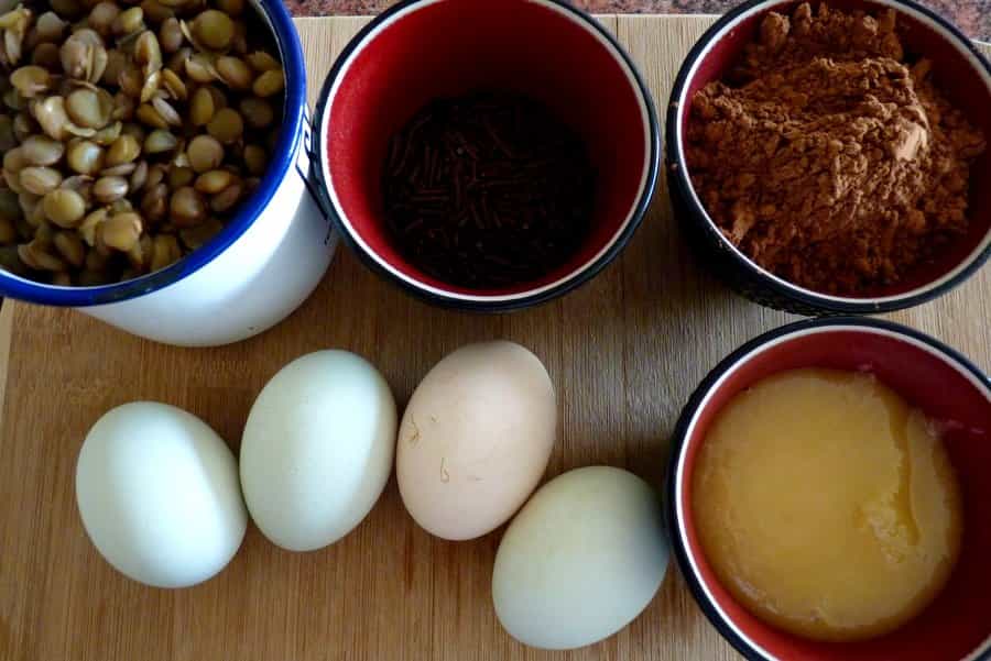Cuece las lentejas en abundante agua, luego cuélalas y déjalas enfriar hasta que alcancen temperatura ambiente. En un procesador de alimentos pon las lentejas junto a los huevos y la miel. Bate y muele bien estos ingredientes hasta alcanzar una mezcla homogénea y suave. Añade la cocoa y vuelve a batir por 1 minuto más. Esto es para asegurarnos que no queden trozos de lentejas.