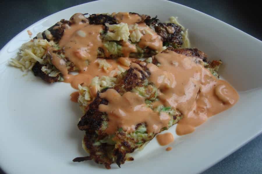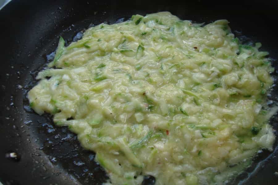 En un sartén con 2 cucharadas de aceite caliente, verter un cucharon de la mezcla de zapallito.