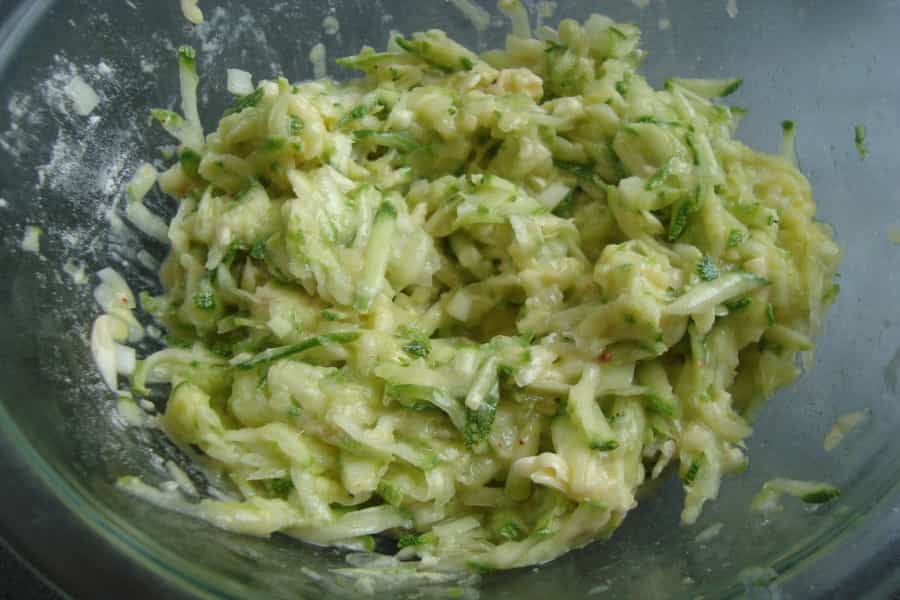 En un recipiente mezclar el zapallo italiano rallado, el ajo picado, la cebolla picada, los huevos, harina, 1/2 taza de queso rallado, orégano, salpimentar a gusto, revolver e integrar bien.