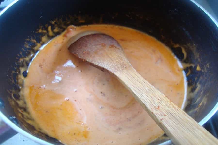 En una olla mezclar salsa de tomate y crema, cocinar a fuego medio revolviendo constantemente, sazonar a gusto, cuando comience a hervir apagar y reservar.