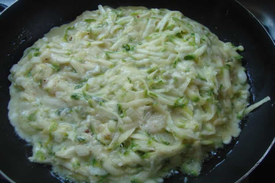 En un sartén con 2 cucharadas de aceite caliente verter la mezcla reposada, cocinar a fuego bajo por 5 a 7 minutos o hasta que este cuajada.
