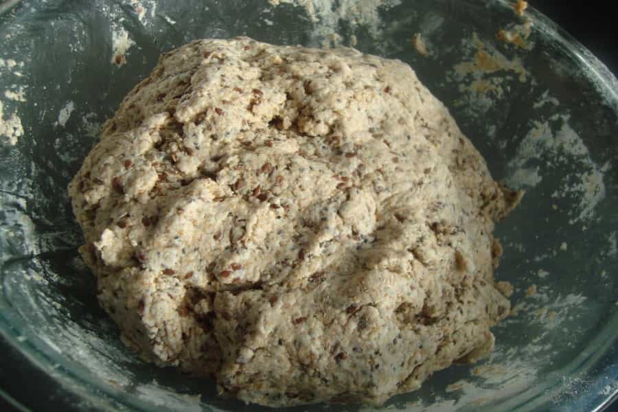 En un recipiente mezclar harina integral, harina común, polvos de hornear, levadura, azúcar y sal. Revolver todo muy bien, incorporar la mantequilla derretida junto con la leche y las semillas de linaza y chía. Unir bien y dejar reposar por 30 minutos en un lugar cálido, tapado con un paño.