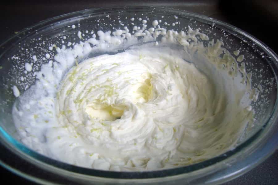En un recipiente batir la crema refrigerada hasta que se endurezca, agregar 1 cucharada de ralladura de limón y 1 cucharada de azúcar flor.