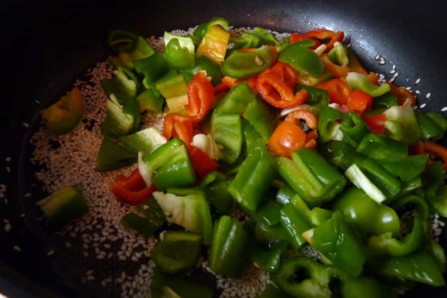 Lavar y cortar los pimentones en trozos medianos. En un sartén poner el aceite de oliva a calentar, agregar el sésamo junto a la sal y pimienta. Cocer por 1 minuto revolviendo constantemente. Agregar los pimentones, revolver y saltear hasta que se comiencen a dorar. Agregar el aceto balsámico, retirar del fuego y revolver bien.