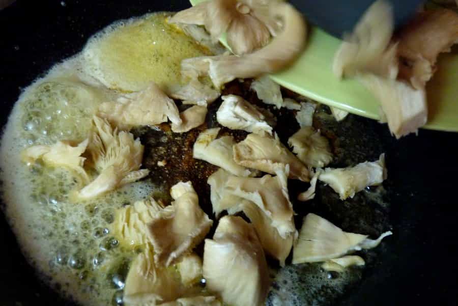 Lavar y cortar los champiñones ostra en trozos medianos. Calentar la mantequilla en un sartén, agregar el ají amarillo y luego los champiñones. Saltear hasta que los hongos estén dorados, agregar el vino blanco, revolver y retirar del fuego.