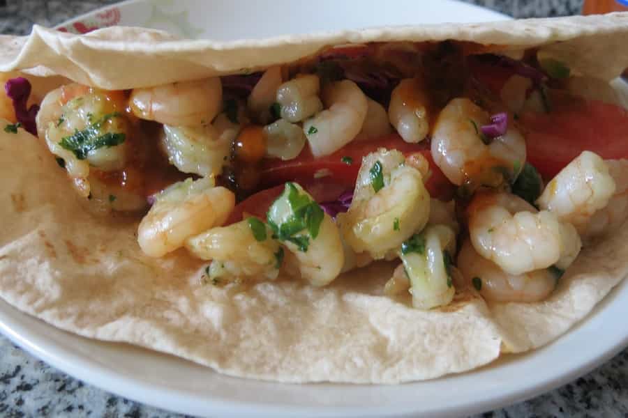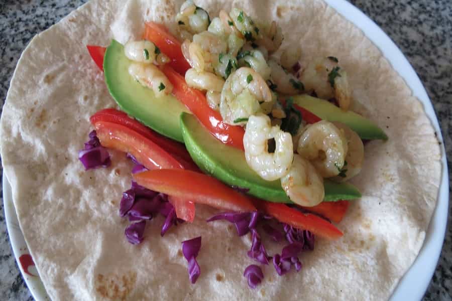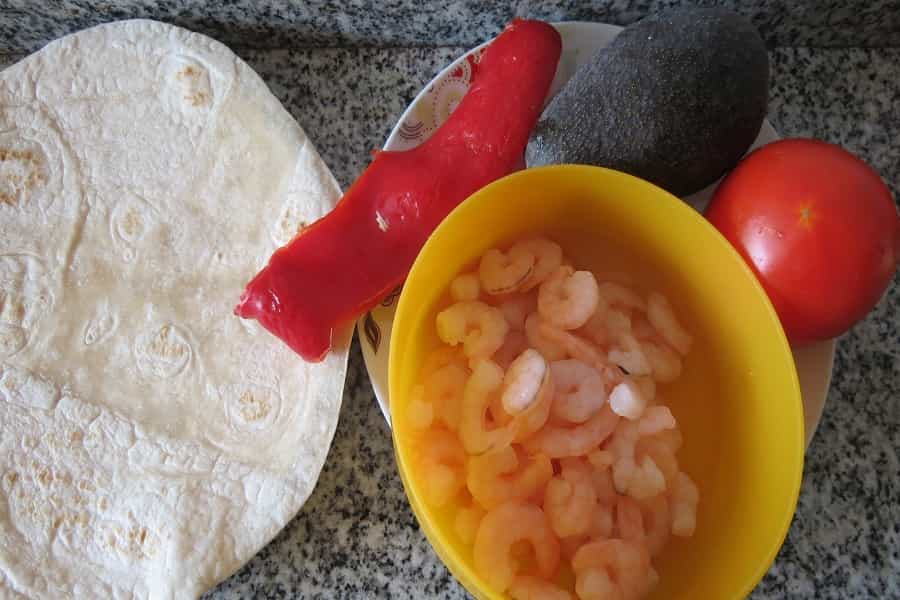 Calentar la tortilla por ambos lados y después colocar los vegetales y camarones sobre ella