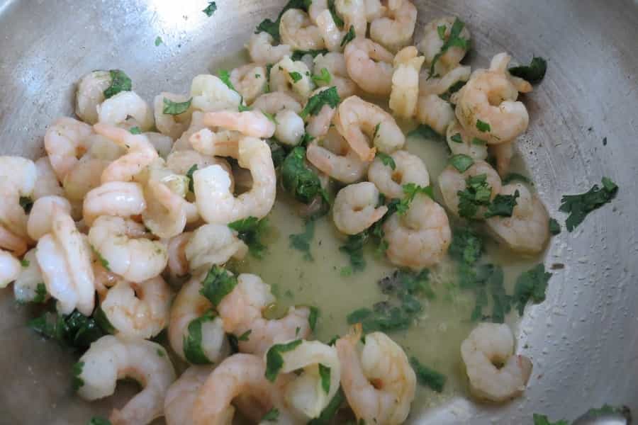 Limpiar los camarones y colocarlos en una sartén con el aceite de oliva, cilantro cortadito, sal y pimienta. Sofreir hasta que estén cocidos.
