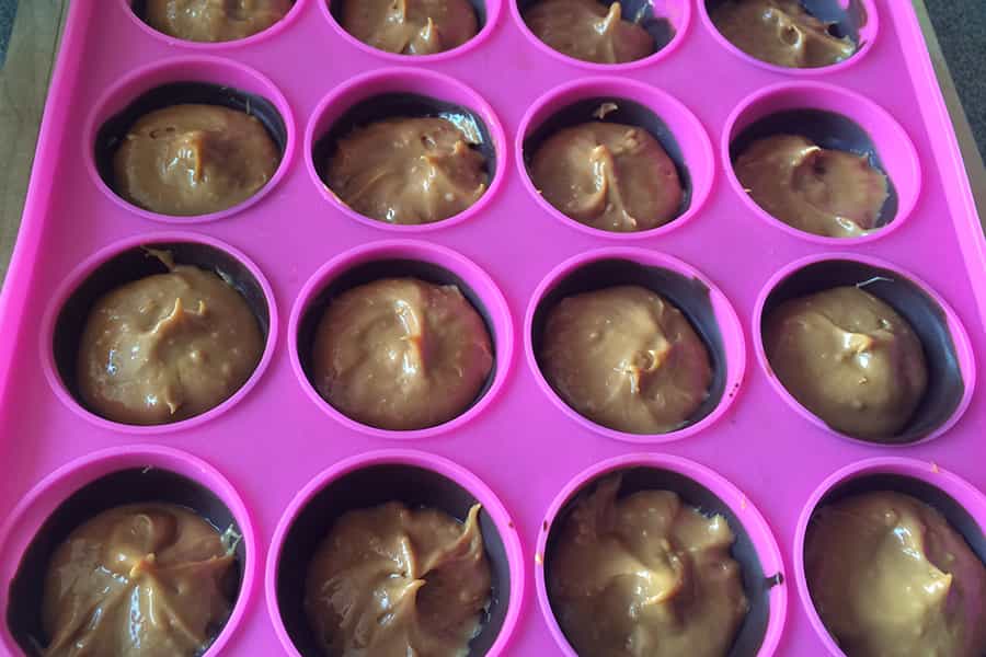 Para que se seque más rápido, puedes poner el molde en el congelador por 2 minutos. Luego, tomarás tu mezcla e irás rellenando los espacios. Es importante que pongas mezcla sólo donde hay chocolate, ya que si pones manjar en una parte del molde sin chocolate, luego no quedará cubierta y el bombón tendrá un hoyito por donde salga el manjar.