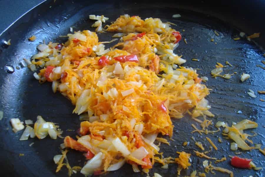 En un sartén con 2 cucharadas de aceite caliente sofreír por 2 minutos la cebolla picada, incorporar la zanahoria pelada y rallada, el pimentón picado.