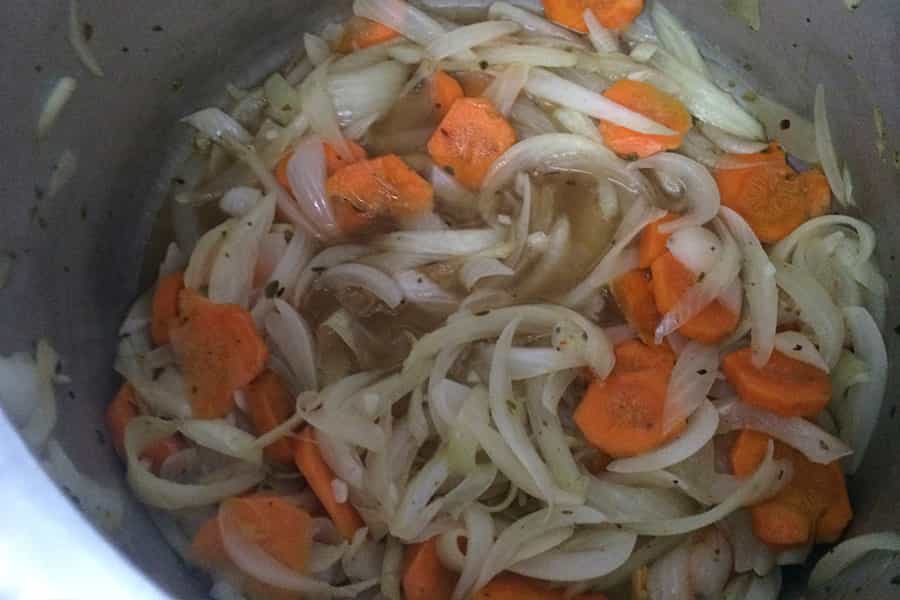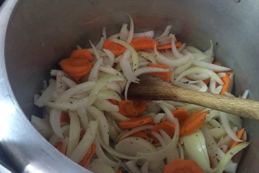 Para esta rica carne a la olla comenzaremos preparando el aliño. Por lo que pondremos un chorrito de aceite de oliva en nuestra olla a presión y comenzaremos a cortar nuestras cebollas, zanahorias y ajo. Añadiremos también la sal a gusto y el orégano.