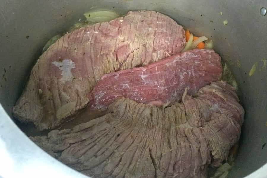 Una vez veamos que la cerveza ya calentó, colocaremos la carne en trozos grandes y la sellaremos. Como la cerveza y nuestro aliño están calientes, la carne se sellará rápidamente. Hacemos eso con todos los trozos y los damos vuelta para que queden totalmente sellados. Como lo sellamos en cerveza, la carne agarrará un sabor distinto al que agarra cuando se sella con agua o aceite.