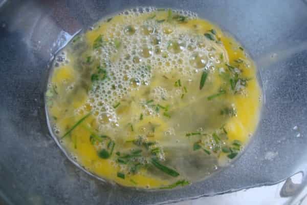 En un recipiente batir los huevos, agregar las hierbas picadas finas, un poco de sal y merquen, reservar.