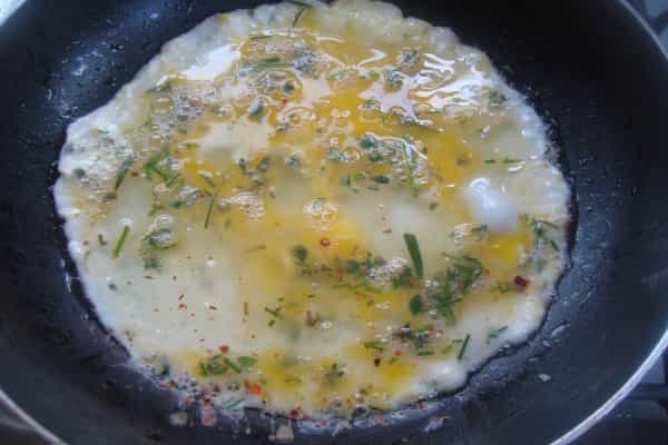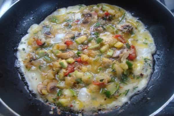 En un sartén con aceite de oliva caliente, verter la preparación de los huevos, dejar cocinar por 1 minuto hasta que la base de la preparación esta cocida.