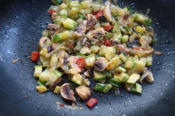 En un sartén con aceite de oliva, saltear el zapallo italiano cortado en cubos pequeños, los pimentones cortados, la cebolla picada en cuadritos, agregar jugo de limón, sazonar a gusto con sal y merquen, incorporar queso rallado. Reservar.