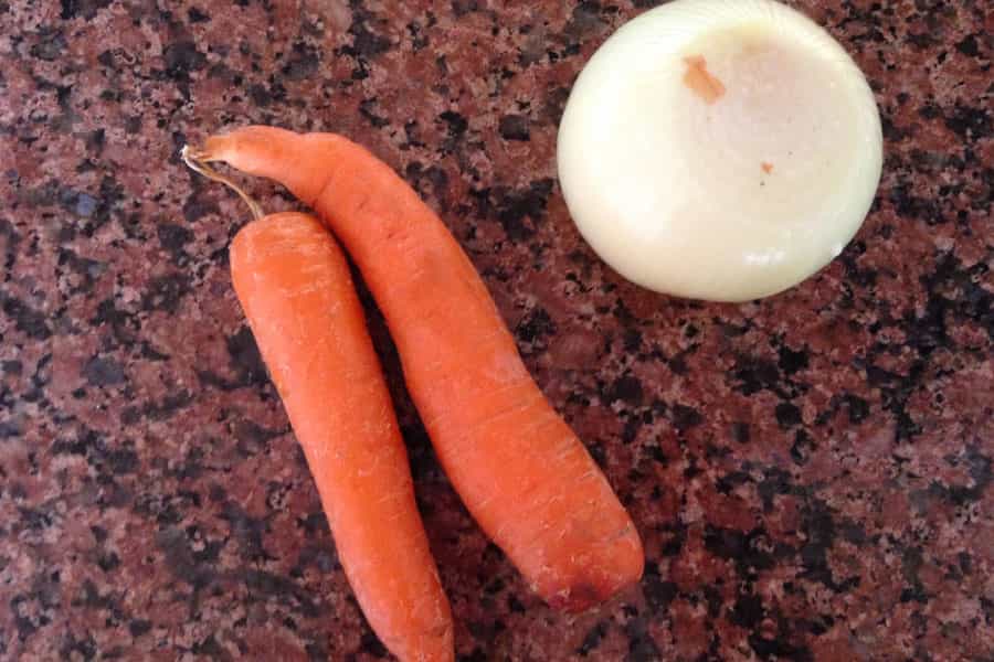Primero pelas la zanahorias y la cortas en rodajas. Puedes cortarla en bastones también, la idea es que sean cortes similares, para que el tiempo de cocción sa el mismo. La cebolla también la cortas en pluma.