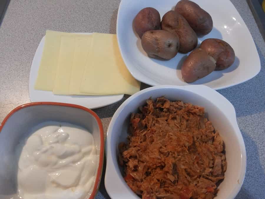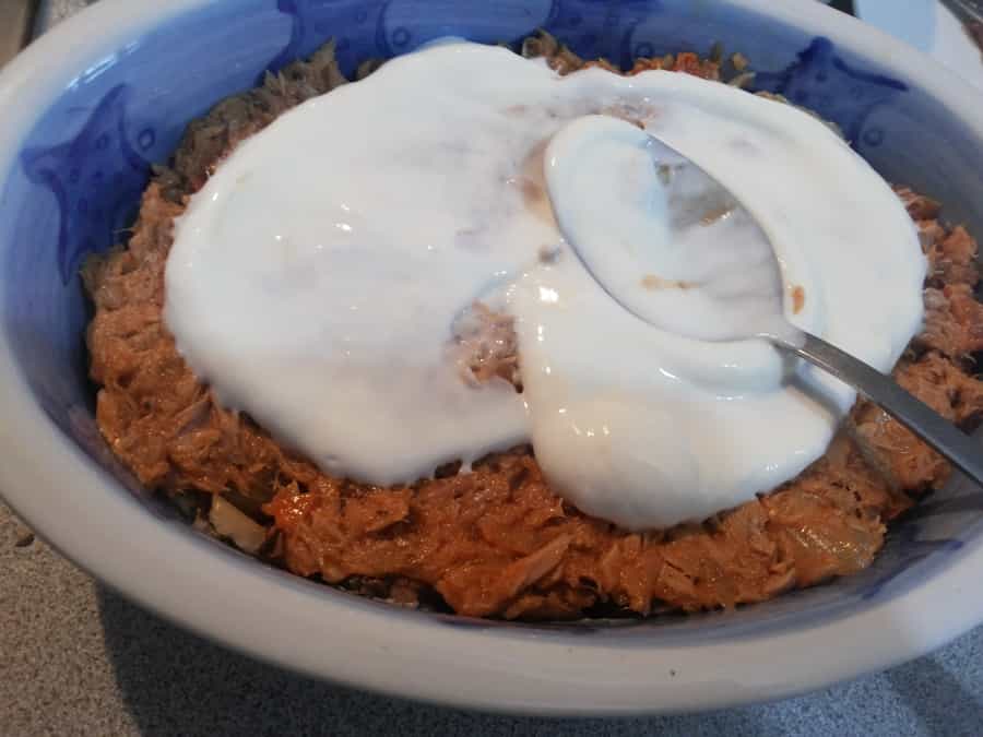 Sobre las papas por el guiso de atún y cúbrelo con el yogurt griego.