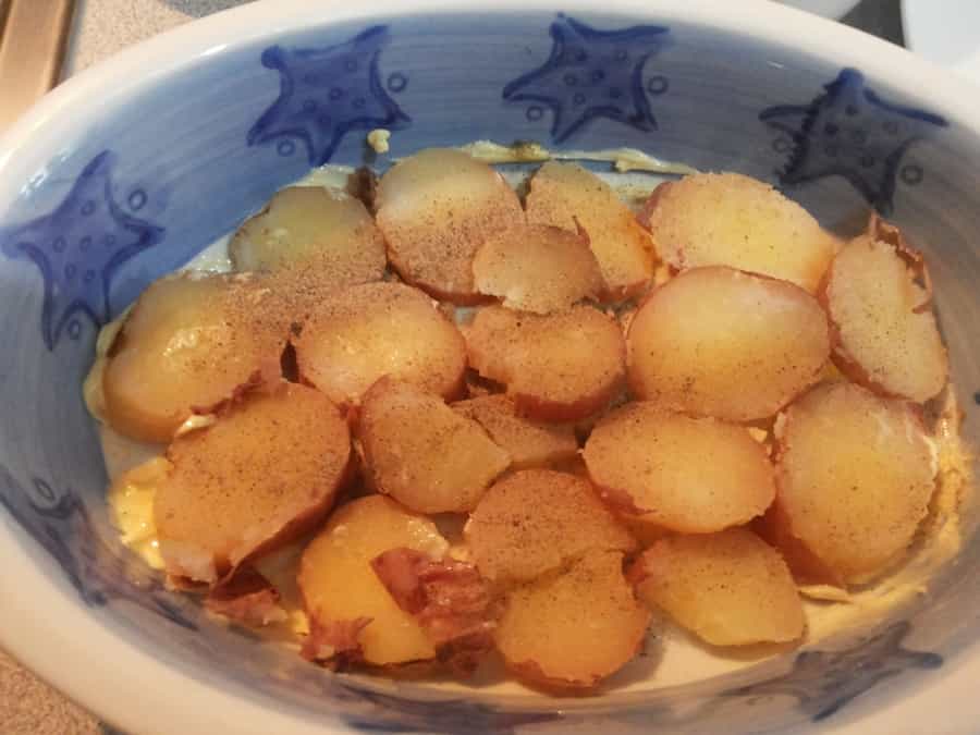 En un molde refractario coloca un poco de mantequilla o aceite para que no se peguen las papas. Coloca rodajas de papa en el fondo forrándolo. Puedes agregar pimienta negra si lo deseas.