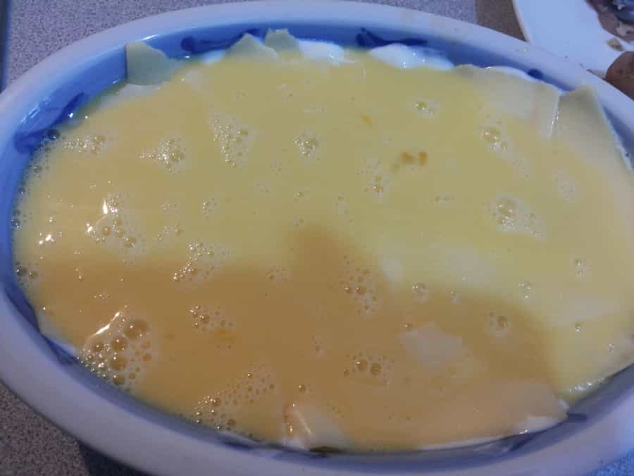 Pon las láminas de queso y los huevos batidos que cubran bien todo el molde.