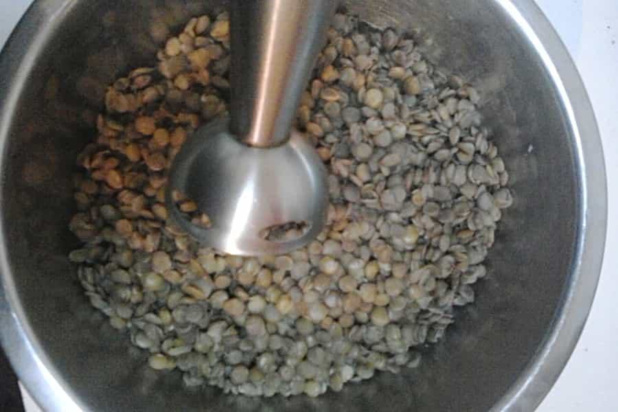 Escurrir las lentejas y vaciar en un recipiente. Con un procesador de alimentos, moler las lentejas sin agua hasta alcanzar una pasta consistente, posteriormente pasar por cedazo. Esto es para que adquiera una textura más suave al paladar.