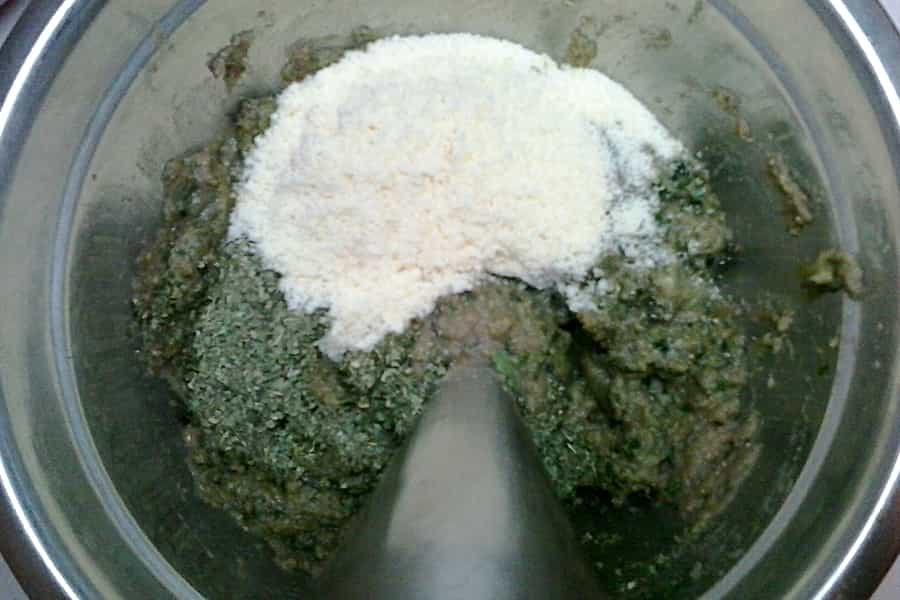 Incorporar la taza de albahaca, los 100 grs de queso parmesano rallado, la ½ taza de perejil, los 4 dientes de ajo, el aceite de oliva y el jugo de limón, para comenzar a moler nuevamente.