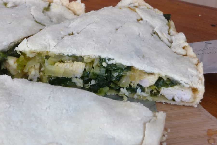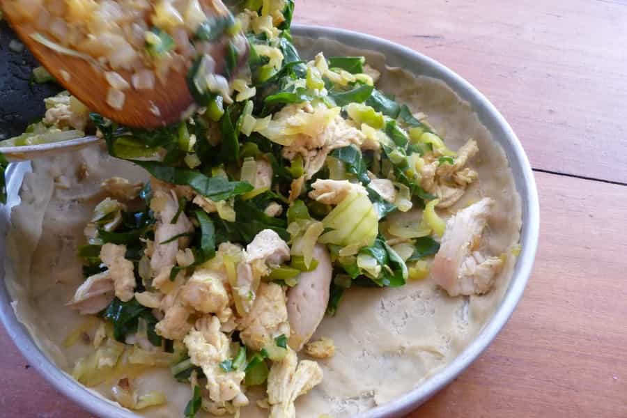 Cuando la cebolla esté transparente, puedes integrar algunas hojas de espinaca o acelga hasta que queden cocidas. No deben ser demasiadas para que no se transforme en una pascualina. Integrar el pollo.
