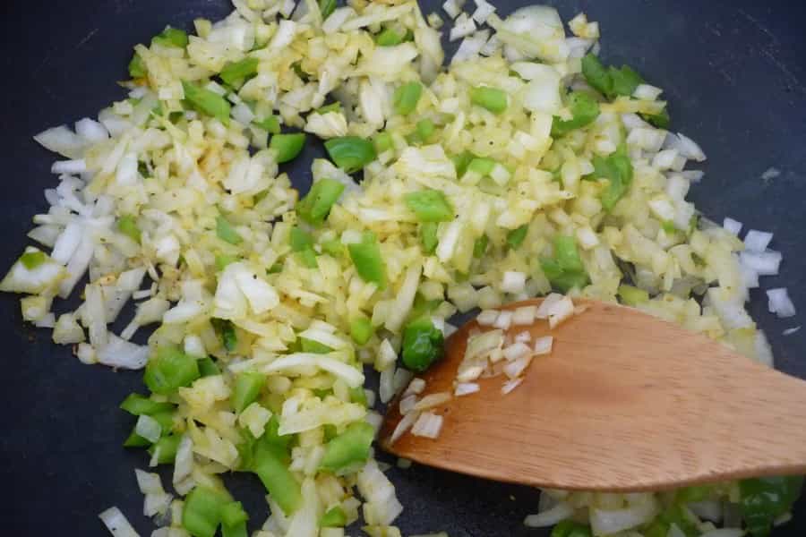 Pon a sudar el pimentón con la cebolla picados en cuadritos pequeños, agrega una pizca de curry, comino y nuez moscada, además de sal.