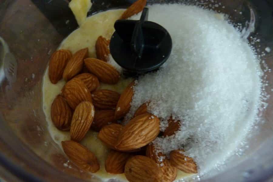 En un procesador muele el plátano y las almendras junto al aceite y el azúcar. La idea es obtener una mezcla homogénea con trocitos de almendra entera.