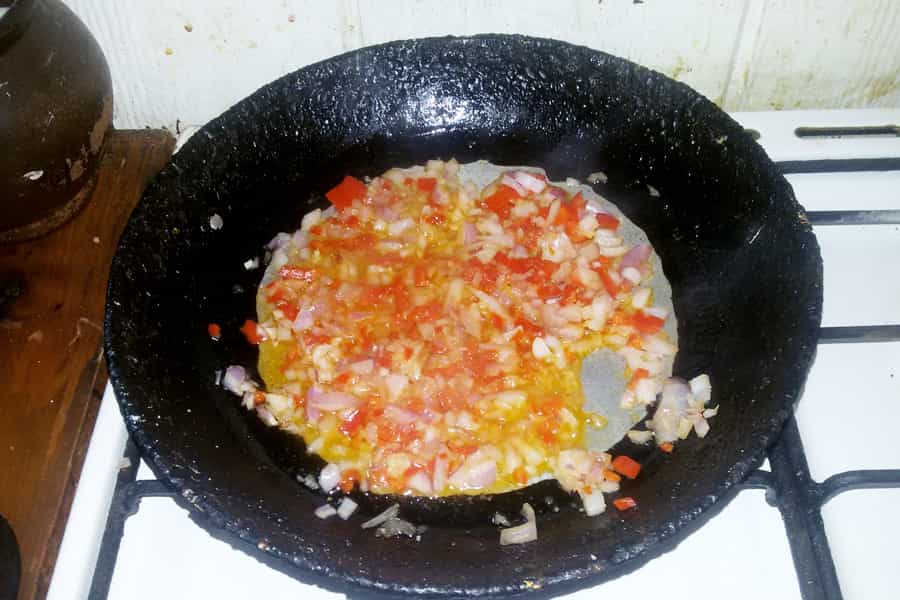 - En un sartén freír la cebolla y el pimentón cortado a cuadritos