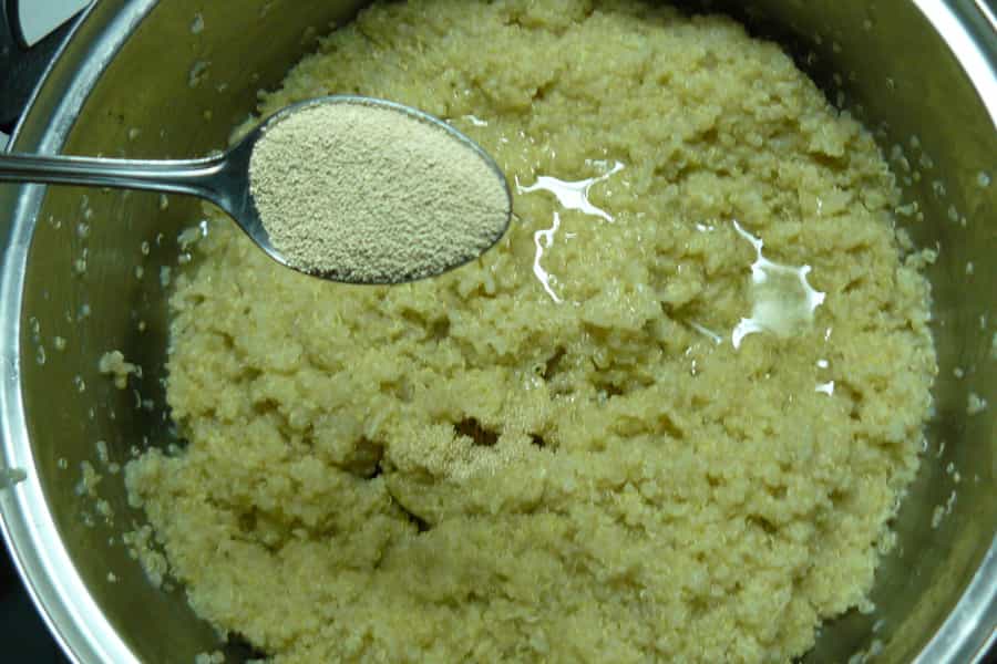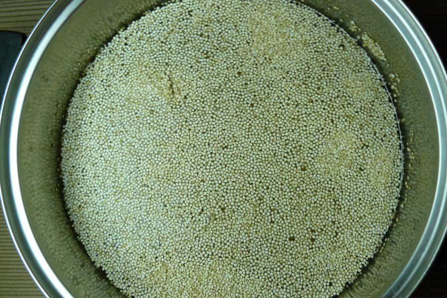 La primera es lavar la quínoa y poner a remojar en agua por al menos 8 horas, al día siguiente escurrir bien, secar y reservar.