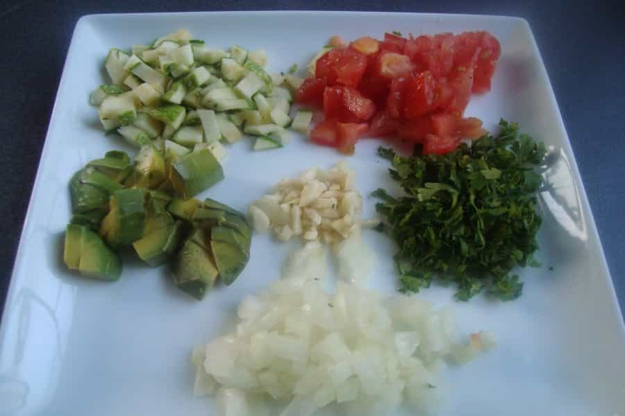 Lavar los zapallos y el tomate, secarlos. Pelar el tomate, la cebolla y la palta. Picar toda la verdura en cubos pequeños. Reservar.