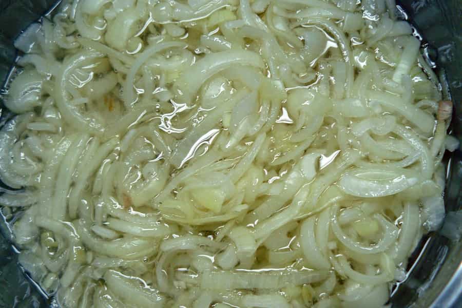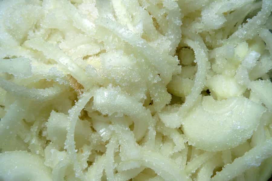 Luego cocinar a fuego medio, hasta que el azúcar se derrita y se mezcle con la cebolla completamente. Cuando haya alcanzado este punto cocinar durante cinco minutos más.