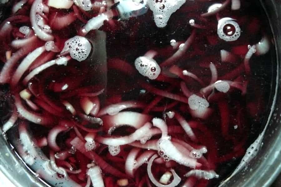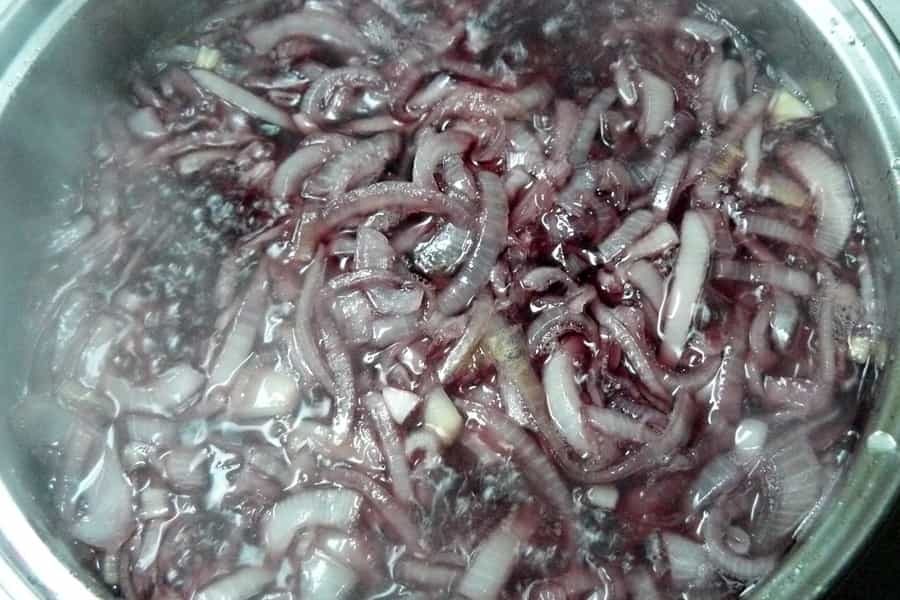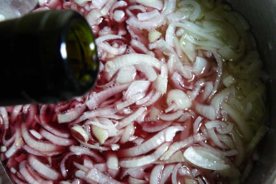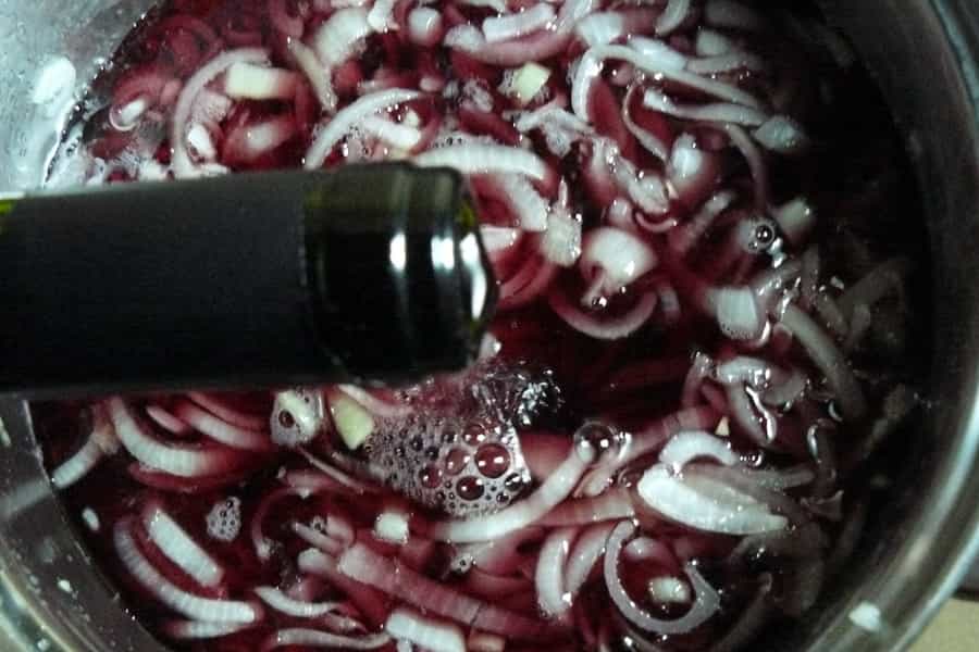 Luego añadir el vino tinto y cocinar a fuego medio bajo.