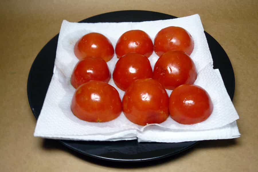 Antes de comenzar, procuremos lavar bien los tomates y la albahaca. Una vez realizado este proceso, parte los tomates por la mitad y quítale las semillas (pepitas). Agrega sal y déjalos boca abajo sobre papel absorbente para que boten todo el jugo que excede. Con media hora de escurrir será suficiente.