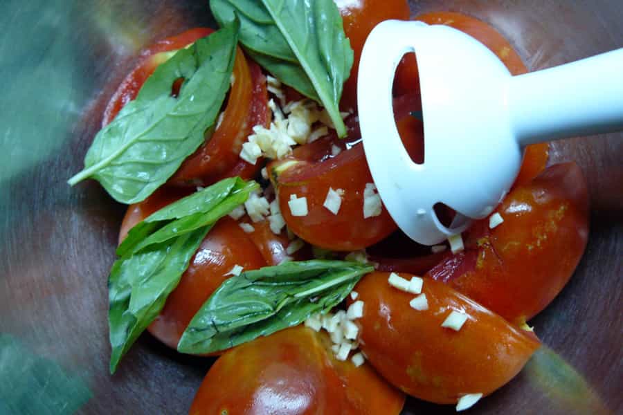 Cuando ya esté listo, procésalos en un bowl junto con el diente de ajo y las hojas de albahaca, hasta alcanzar una salsa homogénea.