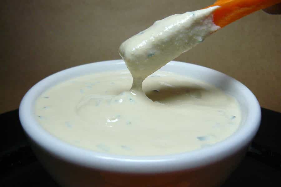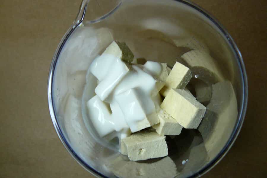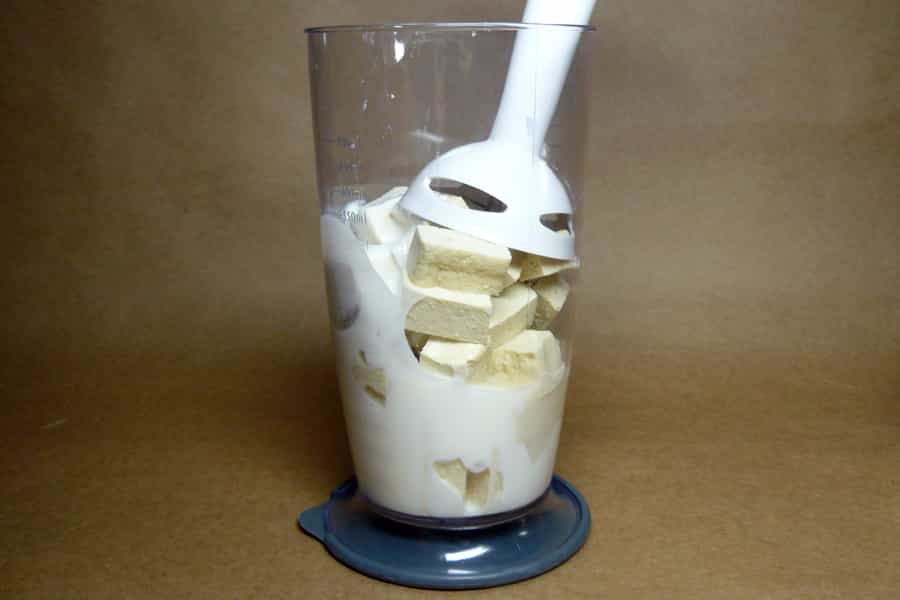 Utilizaremos una minipimer o una licuadora, metemos el tofu dentro junto con el yogurt y el vinagre.