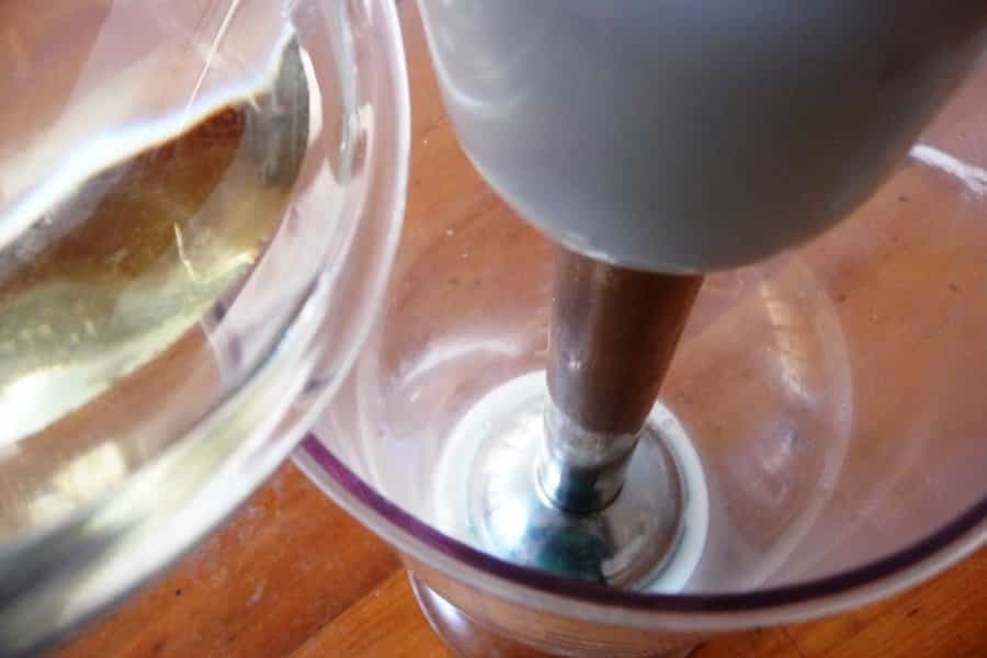 Vierte en el recipiente de tu mini pimer o juguera la leche, enciende la máquina y vierte muy de a poco el aceite. El secreto es ir vertiendo un hilo de aceite en forma continua, paulatinamente, con la pimer encendida, hasta que la mezcla se espese.