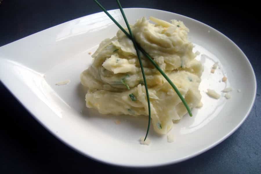 Colocar el puré al fuego por 3 minutos sin dejar de revolver hasta integrar bien. Puedes añadir nuez moscada rallada para dar mayor sabor. Servir caliente, espolvoreado con ciboulette picado y queso parmesano.