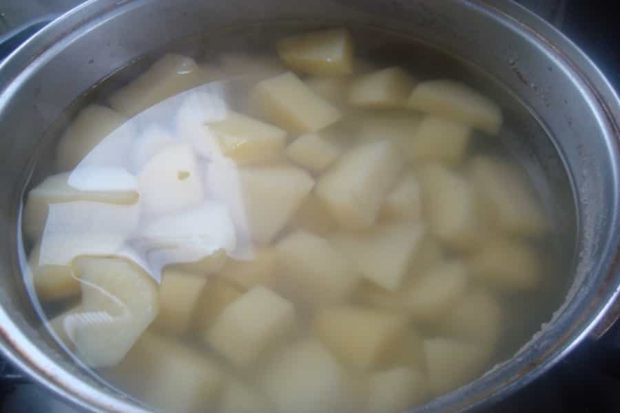 Pelar las papas, partirlas en cuartos y cocinarlas en abundante a gua con una pizca de sal. Cocinar por 15 a 20 minutos o hasta que las papas estén cocidas y tiernas.