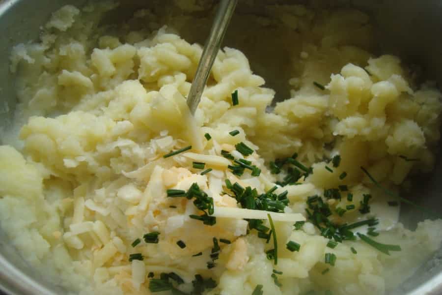 Escurrir y eliminar todo el líquido. Con un moledor de papas o una prensa para moler o con la batidora, moler hasta conseguir el puré. Incorporar mantequilla, crema, leche tibia, queso parmesano y ciboulette , salpimentar a gusto.