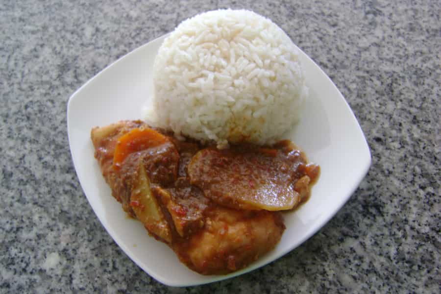 Cuando el pollo esté bien dorado agrega la salsa de tomate, las papas y las zanahorias, tapa la olla y deja cocina todo junto por 15 minutos. Agrega las dos cucharadas de salsa de soya, cocina por aproximadamente 5 minutos hasta que la salsa se reduzca y estará listo para servir.
