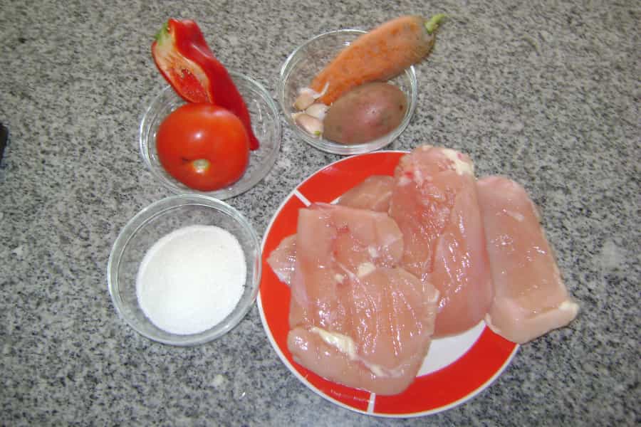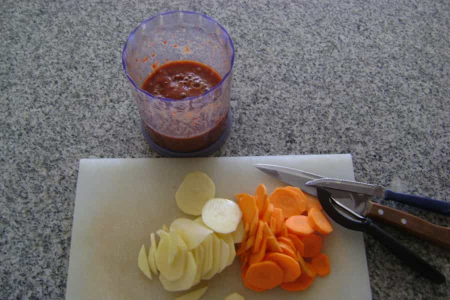 Preparar una salsa licuando el tomate, con los ajos, el pimentón y la media taza de agua. Pica las papas y la zanahoria en finas rodajas y resérvalas.