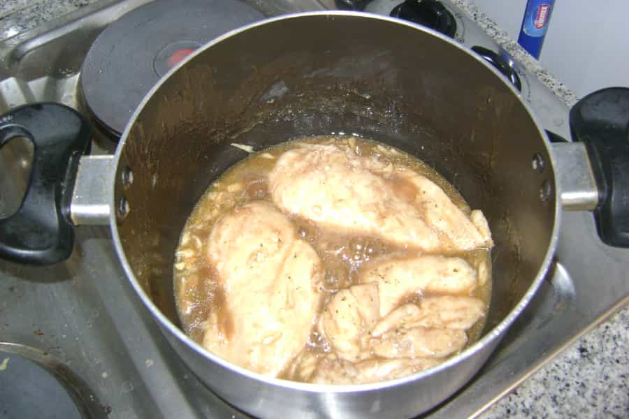 Calienta una olla con las dos cucharadas de aceite, coloca las milanesas de pollo y rocíales el azúcar, déjalas dorar sin dejar de revolver a fuego medio.