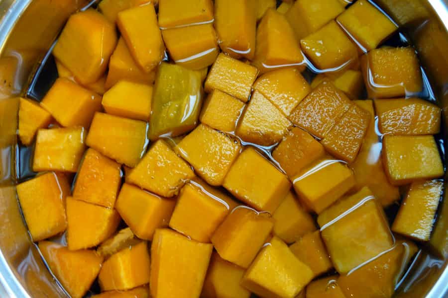 Primero quitamos la cascara del zapallo, con mucho cuidado ya que es dura, luego raspamos la parte interior con una cuchara hasta que hayamos quitado todas las pepas, cortamos el zapallo en trozos pequeños y lo ponemos en una olla con agua a cocer a fuego alto, con 15 minutos estará bien.