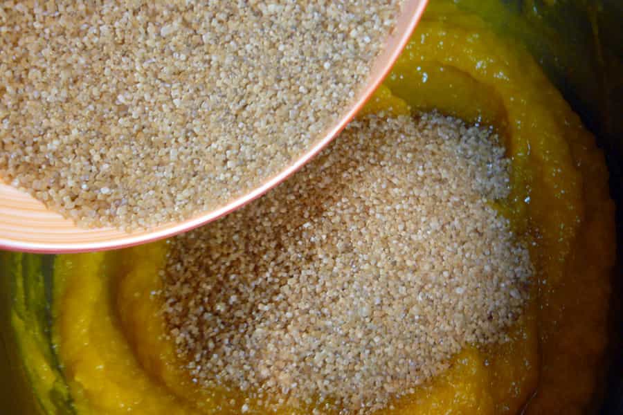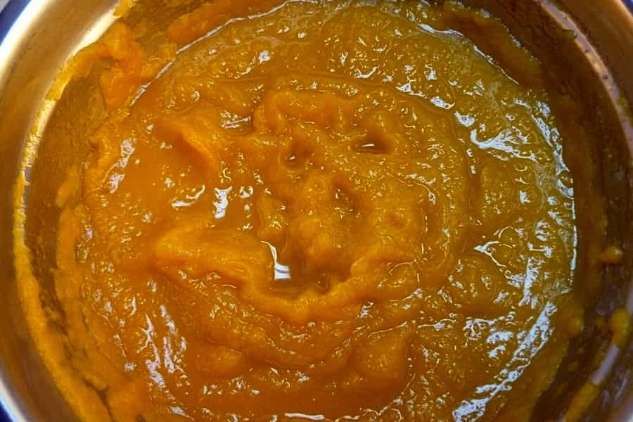 Una vez cocido el zapallo, lo colocamos en un recipiente y lo molemos con una minipimer o una licuadora. Agregamos agua de ser necesario.