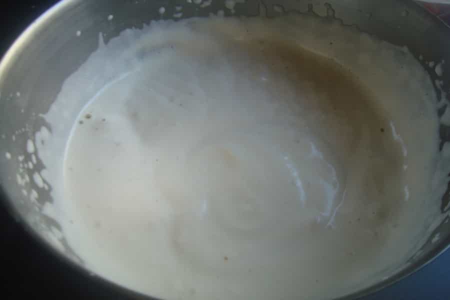 En un recipiente verter la leche evaporada refrigerada y batir hasta que aumente su volumen y se torne cremosa.