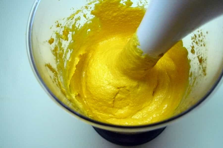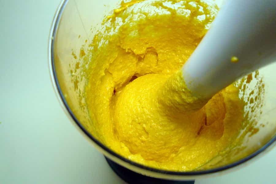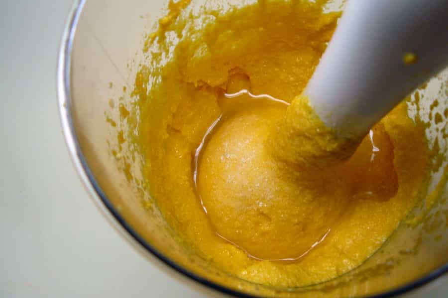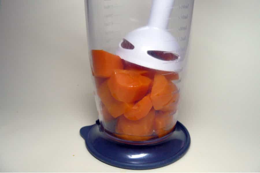 Cortamos la zanahoria, previamente cocida, en pequeños trozos. Luego la colocamos dentro de un bol y la molemos con la minipimer o una licuadora.