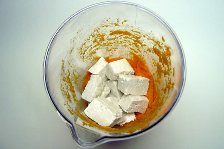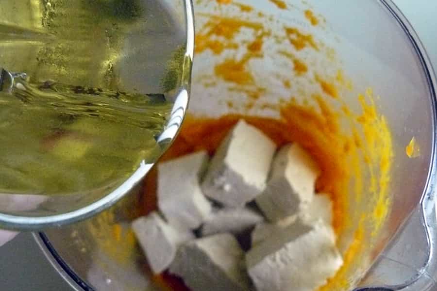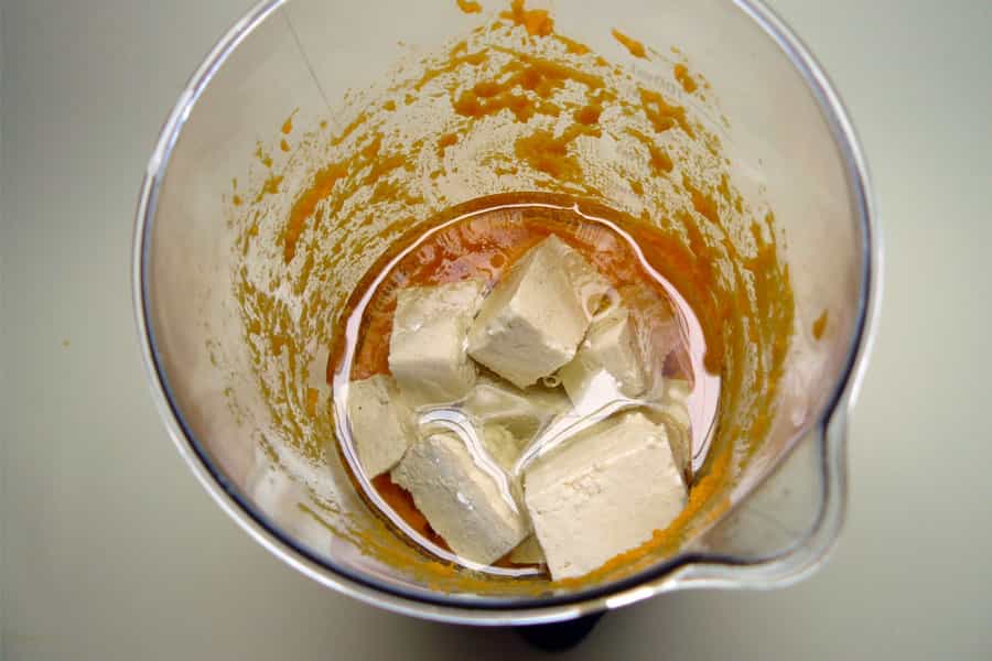 Cortamos el tofu en cuadrados pequeños y lo agregamos a la preparación, molemos.