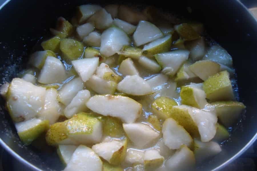 Lavar las pelar eliminar el tallo, partirlas en cuartos y eliminar las semillas. Cortar los cuartos de pera en cubos. En una olla colocar los cubos de pera, el jugo de 1 limón y 2 tazas de azúcar, cocinar destapado a fuego medio hasta que el azúcar se torne de color dorado. Apagar y escurrir las peras hasta eliminar todo el líquido.